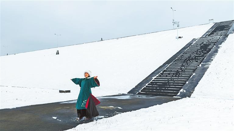 1月1日,光山縣潑河水庫,瑞雪覆蓋了堤壩,游客身著漢服在雪中拍照,盡顯韻味。晏榮榮攝