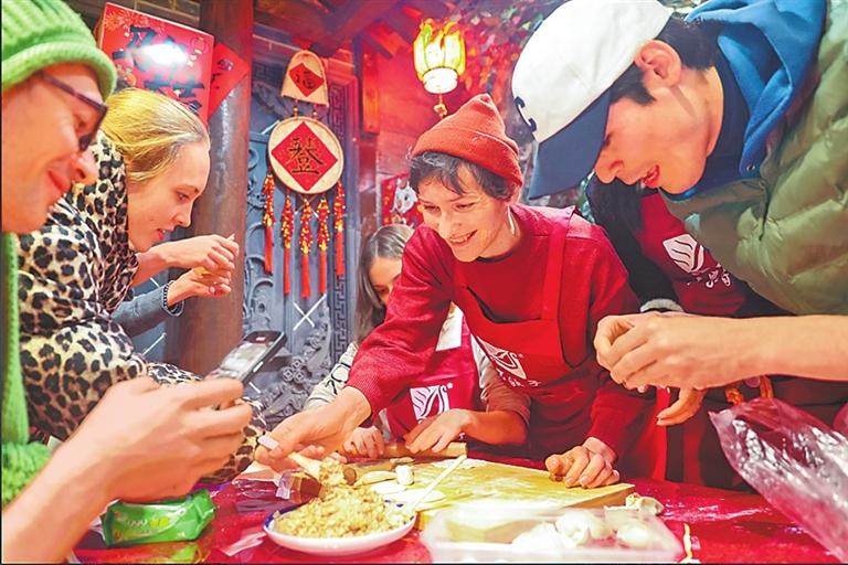 1月1日,三門峽市一家酒店內(nèi),來自俄羅斯的游客在專業(yè)廚師的指導(dǎo)下,體驗(yàn)中國傳統(tǒng)美食餃子的制作過程。孫猛攝