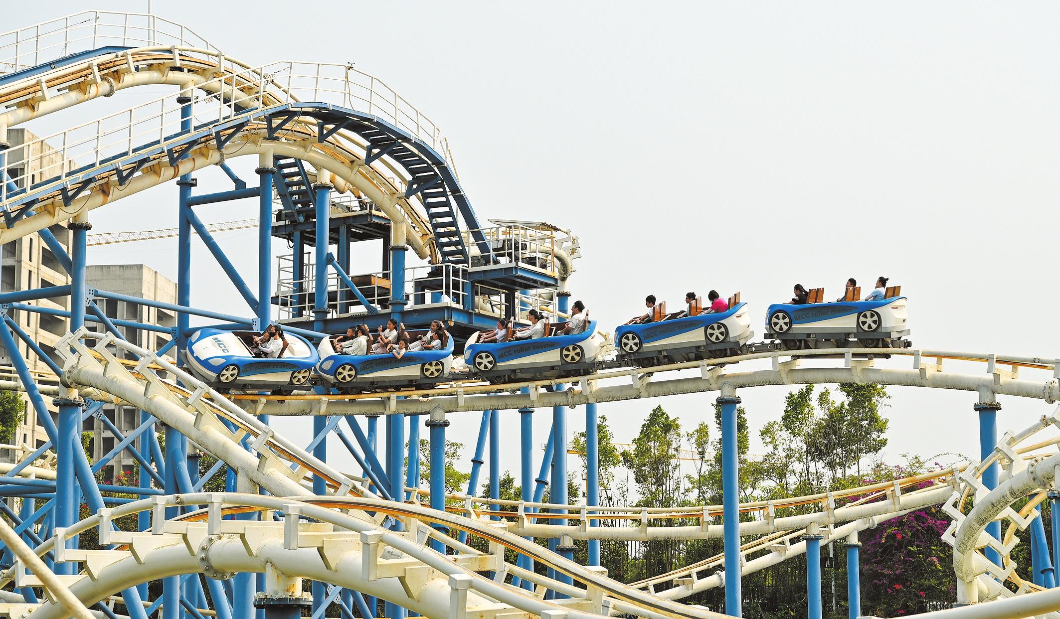 清明假期,海南長影奇幻樂園迎來踏青游玩熱潮。圖為市民游客在體驗(yàn)礦山車。記者 石中華 攝