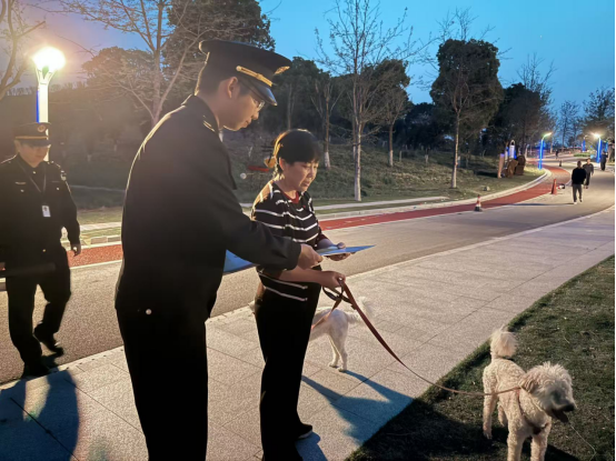 當(dāng)晚,執(zhí)法人員攜帶文明養(yǎng)犬宣傳單頁,在橋西岸路、中山路、橋東岸路等城區(qū)重點(diǎn)路段開展集中宣傳與整治。在鳳山體育公園門口,不少市民帶著寵物散步消食。執(zhí)法人員巡查時(shí)發(fā)現(xiàn),一名中年男子牽著一只犬只,另有兩只犬只未牽繩隨行,在人群中自由穿梭。“白天在家關(guān)了一天,晚上出來遛個(gè)彎,小狗這么乖,肯定不會(huì)咬人。”面對(duì)執(zhí)法人員,男子滿不在乎地解釋。