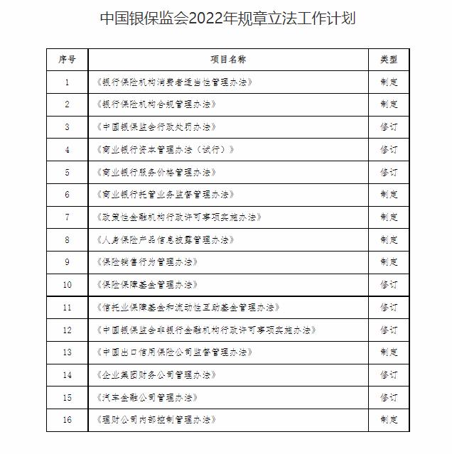 日前,銀保監(jiān)會(huì)公布2022年規(guī)章立法工作計(jì)劃。計(jì)劃包括16項(xiàng)內(nèi)容,其中修訂計(jì)劃8項(xiàng),制定計(jì)劃8項(xiàng)。