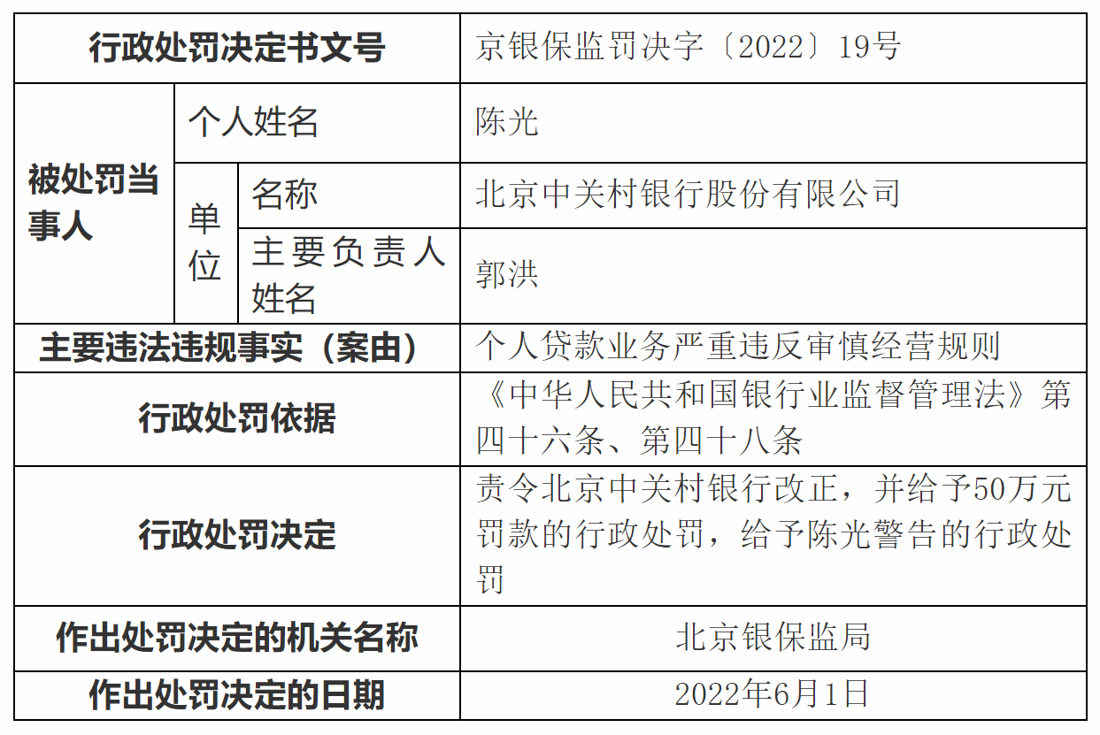 據(jù)銀保監(jiān)會網(wǎng)站消息,近日北京銀保監(jiān)局對北京中關(guān)村銀行開出罰單,針對個人貸款業(yè)務(wù)嚴(yán)重違反審慎經(jīng)營規(guī)則的違法違規(guī)行為,責(zé)令該行改正,罰款50萬元,并對責(zé)任人陳光進行警告。