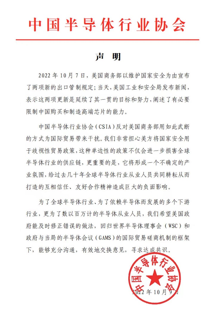 在聲明中,中國半導(dǎo)體行業(yè)協(xié)會(huì)指出,10月7日,美國工業(yè)和安全局發(fā)布新聞,表示這兩項(xiàng)出口管制規(guī)定更新是延續(xù)了其一貫的目標(biāo)和努力,闡述了有必要限制中國購買和制造高端芯片的能力。