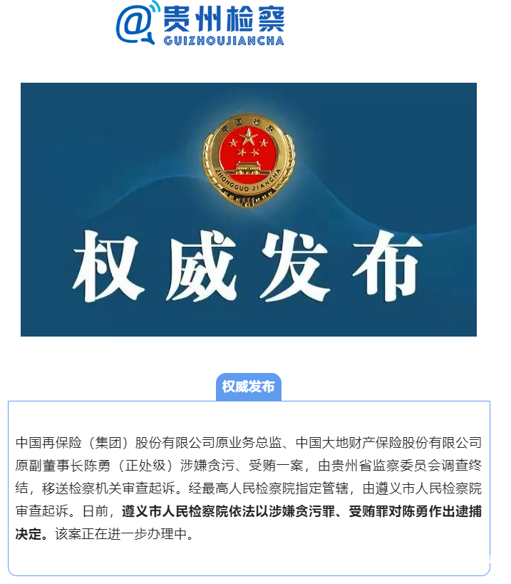 11月30日,貴州省人民檢察院通報,中國再保險(集團)股份有限公司原業(yè)務總監(jiān)、中國大地財產保險股份有限公司原副董事長陳勇(正處級)涉嫌貪污、受賄一案,由貴州省監(jiān)察委員會調查終結,移送檢察機關審查起訴。