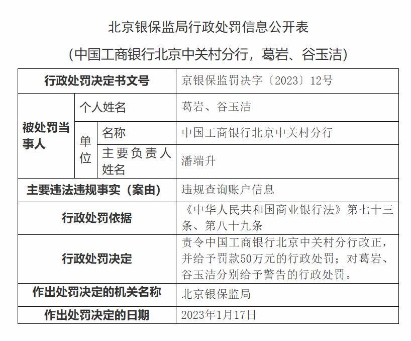 1月28日,北京銀保監(jiān)局行政處罰信息公開(kāi)表顯示,中國(guó)工商銀行北京中關(guān)村分行主要違法違規(guī)事實(shí)為,違規(guī)查詢(xún)賬戶信息。2023年1月17日,北京銀保監(jiān)局責(zé)令中國(guó)工商銀行北京中關(guān)村分行改正,并給予罰款50萬(wàn)元的行政處罰;對(duì)葛巖、谷玉潔分別給予警告的行政處罰。