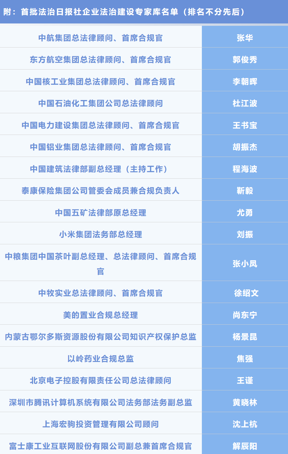 這是法治日?qǐng)?bào)社聘選的首批企業(yè)法治建設(shè)專家,共19位資深企業(yè)法務(wù)專家獲聘,均為來(lái)自知名企業(yè)的總法律顧問(wèn)、首席合規(guī)官、法律合規(guī)部門負(fù)責(zé)人或致力于推動(dòng)企業(yè)法治建設(shè)的專業(yè)人士。