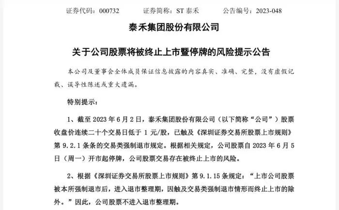 6月2日晚間,ST泰禾公告,截至當(dāng)日,公司股票收盤價連續(xù)20個交易日低于1元/股,已觸及交易類強(qiáng)制退市規(guī)定。根據(jù)相關(guān)規(guī)定,公司股票自6月5日開市起停牌,公司股票交易存在被終止上市的風(fēng)險。