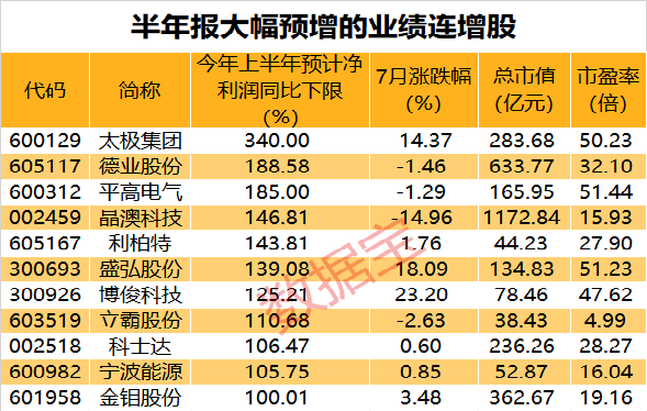 行情上來看,業(yè)績預(yù)計(jì)連增股本月以下跌為主,平均下跌1.23%,萬澤股份、晶澳科技、康緣藥業(yè)、太極集團(tuán)7月以來跌幅均超過14%。