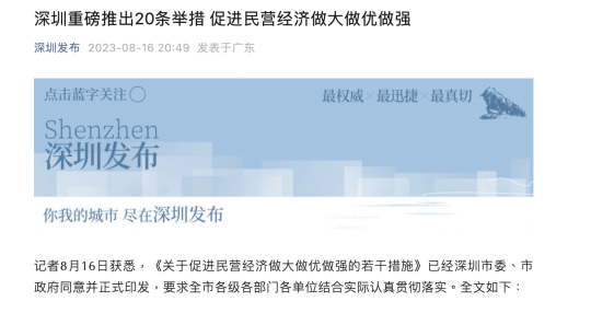近期,各地促進民營經(jīng)濟發(fā)展的政策舉措密集出臺,深圳也密集推出系列政策舉措。8月7日,深圳三大優(yōu)化營商環(huán)境工作方案正式發(fā)布,立足于市場化、法治化、國際化加快營造一流營商環(huán)境。據(jù)深圳發(fā)布16日消息,《關(guān)于促進民營經(jīng)濟做大做優(yōu)做強的若干措施》(下稱《若干措施》)已經(jīng)深圳市委、市政府同意并正式印發(fā),提出20項舉措,加速釋放民營企業(yè)發(fā)展動能。