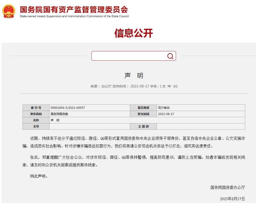 國務(wù)院國有資產(chǎn)監(jiān)督管理委員會(huì)網(wǎng)站8月17日發(fā)布聲明稱,近期,持續(xù)有不法分子通過短信、微信、QQ等形式冒用國資委和中央企業(yè)領(lǐng)導(dǎo)干部身份,甚至偽造中央企業(yè)公章、公文實(shí)施詐騙,造成惡劣社會(huì)影響。針對(duì)涉嫌詐騙違法犯罪行為,國務(wù)院國資委將商請(qǐng)公安司法機(jī)關(guān)依法予以打擊,追究其法律責(zé)任。