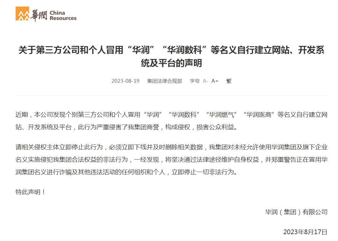華潤(集團(tuán))有限公司(以下簡稱“華潤集團(tuán)”)的聲明稱,近期,公司發(fā)現(xiàn)個(gè)別第三方公司和個(gè)人冒用“華潤”“華潤數(shù)科”“華潤燃?xì)狻薄叭A潤醫(yī)商”等名義自行建立網(wǎng)站、開發(fā)系統(tǒng)及平臺(tái),此行為嚴(yán)重侵害了華潤集團(tuán)商譽(yù),構(gòu)成侵權(quán),損害公眾利益。
