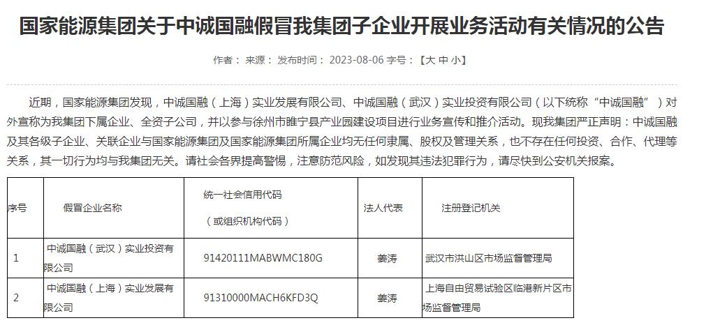 8月6日,國家能源集團(tuán)發(fā)布了關(guān)于中誠國融假冒集團(tuán)子企業(yè)開展業(yè)務(wù)活動(dòng)有關(guān)情況的公告。