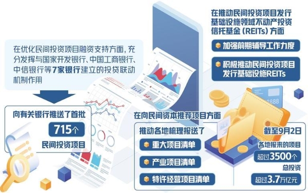 為貫徹落實《意見》,國家發(fā)展改革委印發(fā)了《關于進一步抓好抓實促進民間投資工作努力調(diào)動民間投資積極性的通知》,提出了17項有針對性的具體措施。據(jù)介紹,在優(yōu)化民間投資項目融資支持方面,充分發(fā)揮與國家開發(fā)銀行、中國工商銀行、中信銀行等7家銀行建立的投貸聯(lián)動機制作用,向有關銀行推送了首批715個民間投資項目,請有關金融機構按照市場化、法治化原則,自主選擇符合條件的項目給予金融支持。在向民間資本推薦項目方面,推動各地梳理報送了重大項目清單、產(chǎn)業(yè)項目清單、特許經(jīng)營項目清單。截至9月2日,各地報來的項目超過3500個,總投資超過3.7萬億元。在推動民間投資項目發(fā)行基礎設施領域不動產(chǎn)投資信托基金(REITs)方面,加強前期輔導工作力度,積極推動民間投資項目發(fā)行基礎設施REITs。近日,國家發(fā)展改革委向證監(jiān)會推薦了金風科技風力發(fā)電項目,這是推薦的首單民間投資清潔能源REITs項目。