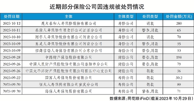 同花順數據顯示,以處罰日期作為統計依據,截至10月29日記者發(fā)稿,今年下半年以來,各類主管機關共對約500家次保險公司的違規(guī)行為作出處罰,處罰金額達1.02億元。合計處罰次數、合計處罰金額兩項指標較去年同期均呈上升趨勢。