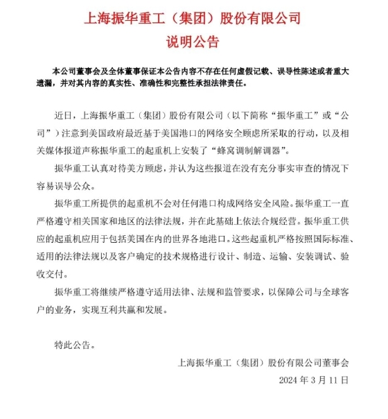 3月10日晚間,振華重工發(fā)布公告稱,公司注意到美國政府最近基于對美國港口的網(wǎng)絡(luò)安全顧慮所采取的行動,以及相關(guān)媒體報道稱振華重工的起重機(jī)上安裝了“蜂窩調(diào)制解調(diào)器”。公司強(qiáng)調(diào),其所提供的起重機(jī)不會對任何港口構(gòu)成網(wǎng)絡(luò)安全風(fēng)險。公司一直嚴(yán)格遵守相關(guān)國家和地區(qū)的法律法規(guī),并在此基礎(chǔ)上依法合規(guī)經(jīng)營。