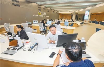 在海口江東新區(qū)政務服務中心辦事大廳,工作人員為市民提供咨詢服務。李天平 攝