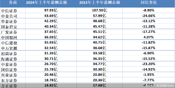 具體來(lái)看,券商“一哥”中信證券薪酬總額遙遙領(lǐng)先,上半年相關(guān)數(shù)據(jù)為97.93億元,但相較之下,中信證券2023年上半年薪酬總額則超百億,為107.5億元,同比減少8.9%。