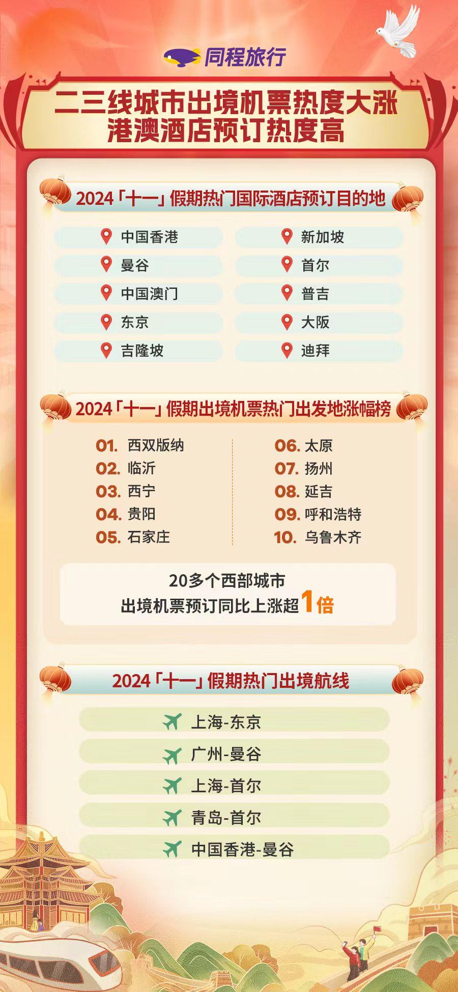 在客源地方面,國內二三線城市居民特別是西部各省區(qū)市居民出境游需求快速增長。同程旅行數據顯示,今年“十一”假期出境游機票出發(fā)地中,西雙版納、臨沂、西寧、貴陽、石家莊等城市出境航班預訂熱度漲幅最高。有20多個西部城市出境機票預訂同比漲幅超過1倍。