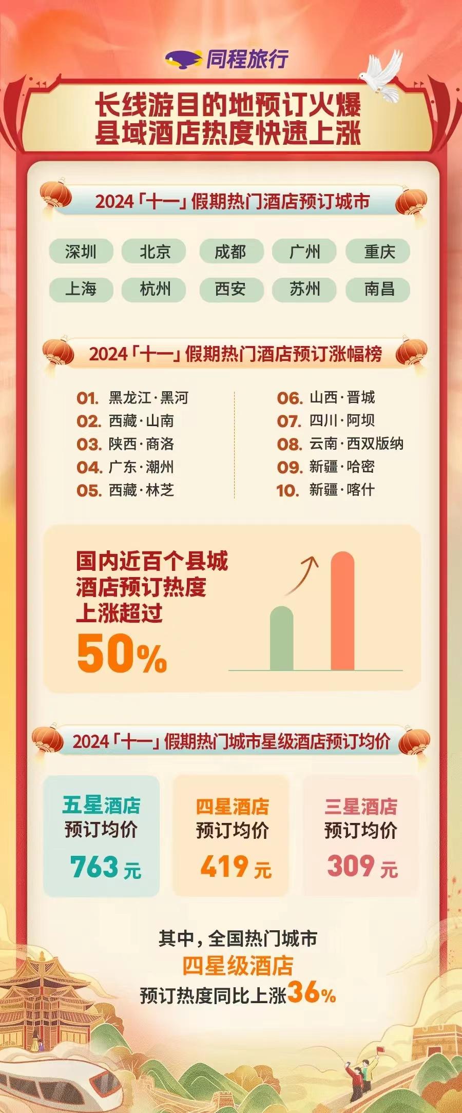在目的地選擇上,深圳、北京、成都、廣州、重慶、上海、杭州、西安、蘇州、南昌是國內最熱門的酒店預訂城市。東北和西部長線目的地,是城市居民長假出游的熱門選擇,黑龍江的黑河,西藏的山南、林芝,新疆的哈密和喀什,以及四川阿壩、云南西雙版納等長線游目的地進入酒店預訂漲幅榜前十。受國產游戲《黑神話悟空》的持續(xù)帶動,山西的晉城酒店預訂熱度快速上漲,位列榜單第六。