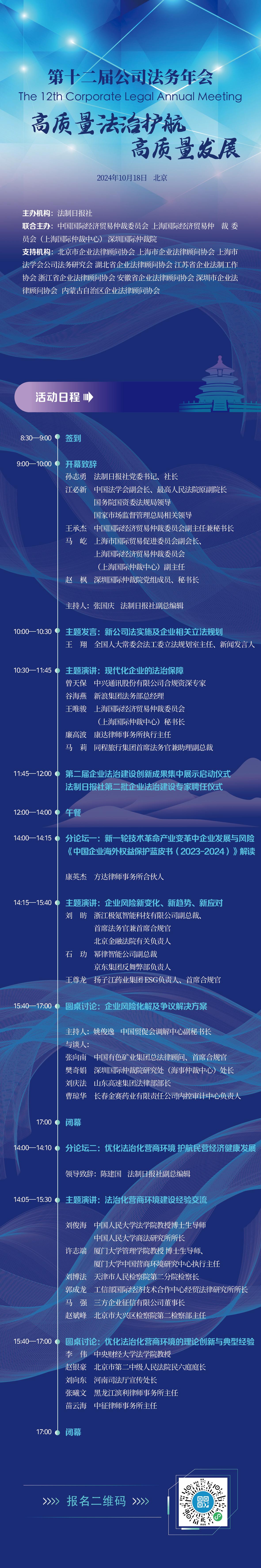2024年是實現(xiàn)“十四五”規(guī)劃目標任務(wù)的關(guān)鍵一年。面對新一輪科技革命和產(chǎn)業(yè)變革,企業(yè)在迎來發(fā)展新機遇的同時,也面臨著數(shù)據(jù)安全治理、知識產(chǎn)權(quán)保護、反壟斷、出口管制、經(jīng)濟制裁等諸多法律風險和挑戰(zhàn)。為此,法制日報社將舉辦“第十二屆公司法務(wù)年會(北京)”活動,旨在共同探尋企業(yè)在法治軌道上實現(xiàn)高質(zhì)量發(fā)展的路徑和策略,推動企業(yè)在以中國式現(xiàn)代化全面推進強國建設(shè)、民族復興偉業(yè)中作出更大貢獻。