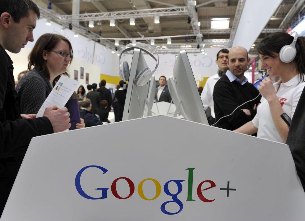 這張資料照片顯示,2012年3月6日,在德國漢諾威會(huì)展中心舉行的漢諾威信息及通信技術(shù)博覽會(huì)上,參觀者在谷歌展臺(tái)參觀。新華社記者馬寧攝
