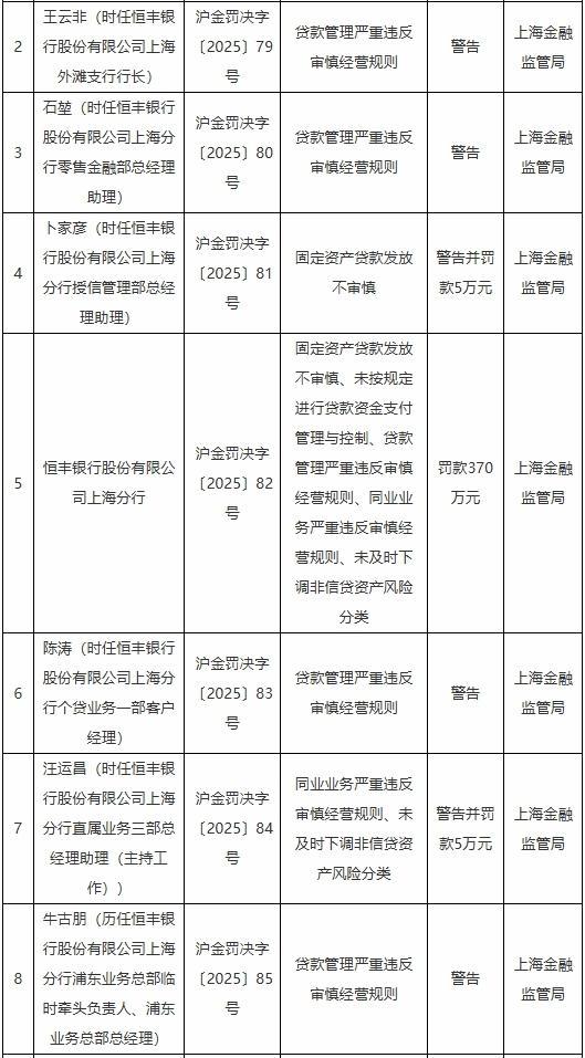 具體看,時任恒豐銀行上海分行授信管理部總經(jīng)理助理卜家彥被警告并罰款5萬元,涉及的主要違法違規(guī)行為是固定資產(chǎn)貸款發(fā)放不審慎;時任恒豐銀行上海分行直屬業(yè)務(wù)三部總經(jīng)理助理(主持工作)汪運昌被警告并罰款5萬元,涉及的主要違法違規(guī)行為是同業(yè)業(yè)務(wù)嚴重違反審慎經(jīng)營規(guī)則、未及時下調(diào)非信貸資產(chǎn)風(fēng)險分類;時任恒豐銀行上海外灘支行行長王云非,時任恒豐銀行上海分行零售金融部總經(jīng)理助理石堃,時任恒豐銀行上海分行個貸業(yè)務(wù)一部客戶經(jīng)理陳濤,以及牛古朋被警告,牛古朋歷任恒豐銀行上海分行浦東業(yè)務(wù)總部臨時牽頭負責(zé)人、浦東業(yè)務(wù)總部總經(jīng)理,他們涉及的主要違法違規(guī)行為是貸款管理嚴重違反審慎經(jīng)營規(guī)則。