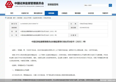 5月30日,安徽證監(jiān)局發(fā)布公告指出,時任中信證券信息技術中心高級經(jīng)理李海鵬存在違法行為,其獲得中信證券CRM系統(tǒng)應用開發(fā)崗權限,可以獲取中信證券所有客戶的賬戶信息、資產(chǎn)規(guī)模、交易持倉等未公開信息。2019年11月1日至2023年2月21日,李海鵬通過CRM系統(tǒng),獲知高某基金的持倉、委托、當日成交記錄等未公開信息,其利用未公開信息違規(guī)交易股票,同時存在趨同交易的情況。安徽證監(jiān)局決定,沒收李海鵬違法所得213.14萬元,并處以213.14萬元罰款。
