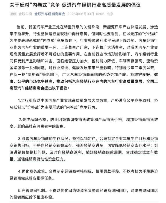 6月3日,全國工商聯(lián)汽車經(jīng)銷商商會發(fā)布《關(guān)于反對“內(nèi)卷式”競爭 促進汽車經(jīng)銷行業(yè)高質(zhì)量發(fā)展的倡議》。