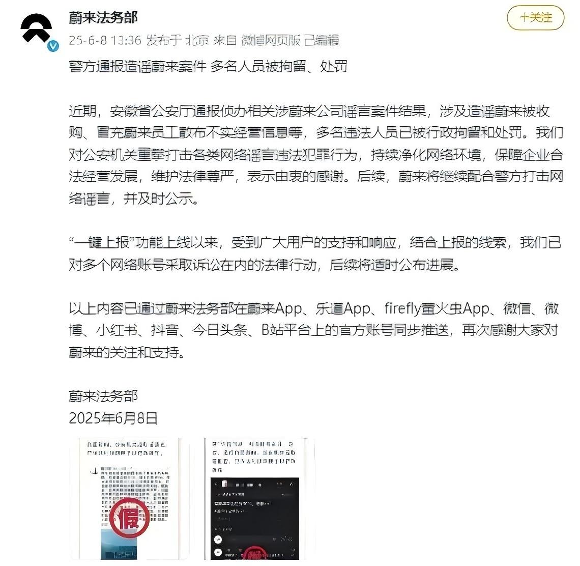 近期,安徽省公安廳通報(bào)偵辦相關(guān)涉蔚來公司謠言案件結(jié)果,涉及造謠蔚來被收購、冒充蔚來員工散布不實(shí)經(jīng)營信息等,多名違法人員已被行政拘留和處罰。我們對(duì)公安機(jī)關(guān)重拳打擊各類網(wǎng)絡(luò)謠言違法犯罪行為,持續(xù)凈化網(wǎng)絡(luò)環(huán)境,保障企業(yè)合法經(jīng)營發(fā)展,維護(hù)法律尊嚴(yán),表示由衷的感謝。后續(xù),蔚來將繼續(xù)配合警方打擊網(wǎng)絡(luò)謠言,并及時(shí)公示。