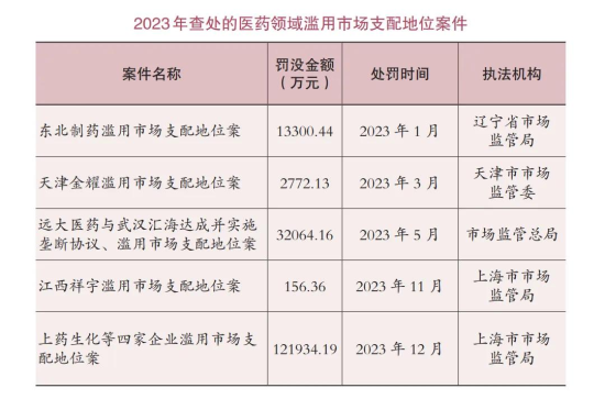 去年6月,根據(jù)市場(chǎng)監(jiān)管總局(國(guó)家反壟斷局)發(fā)布的《中國(guó)反壟斷執(zhí)法年度報(bào)告(2023)》,醫(yī)藥領(lǐng)域共查處濫用市場(chǎng)支配地位案件5件,罰沒(méi)金額合計(jì)17.02億元。其中4起都為原料藥市場(chǎng)壟斷,另外1起為短缺藥不公平高價(jià)行為壟斷調(diào)查案件。