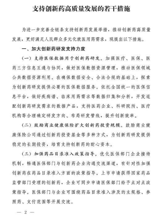 以下為《支持創(chuàng)新藥高質(zhì)量發(fā)展的若干措施》全文: