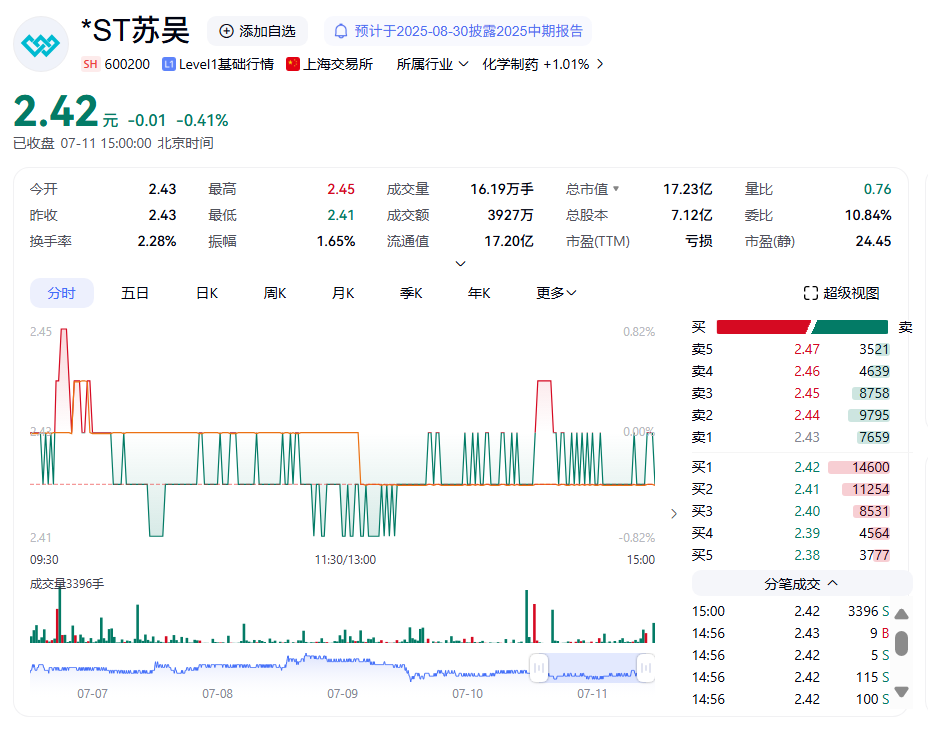 截至7月11日,*ST蘇吳股價(jià)報(bào)2.42元/股,總市值17.23億元。截至2025年3月31日,公司股東達(dá)到8.6萬戶。