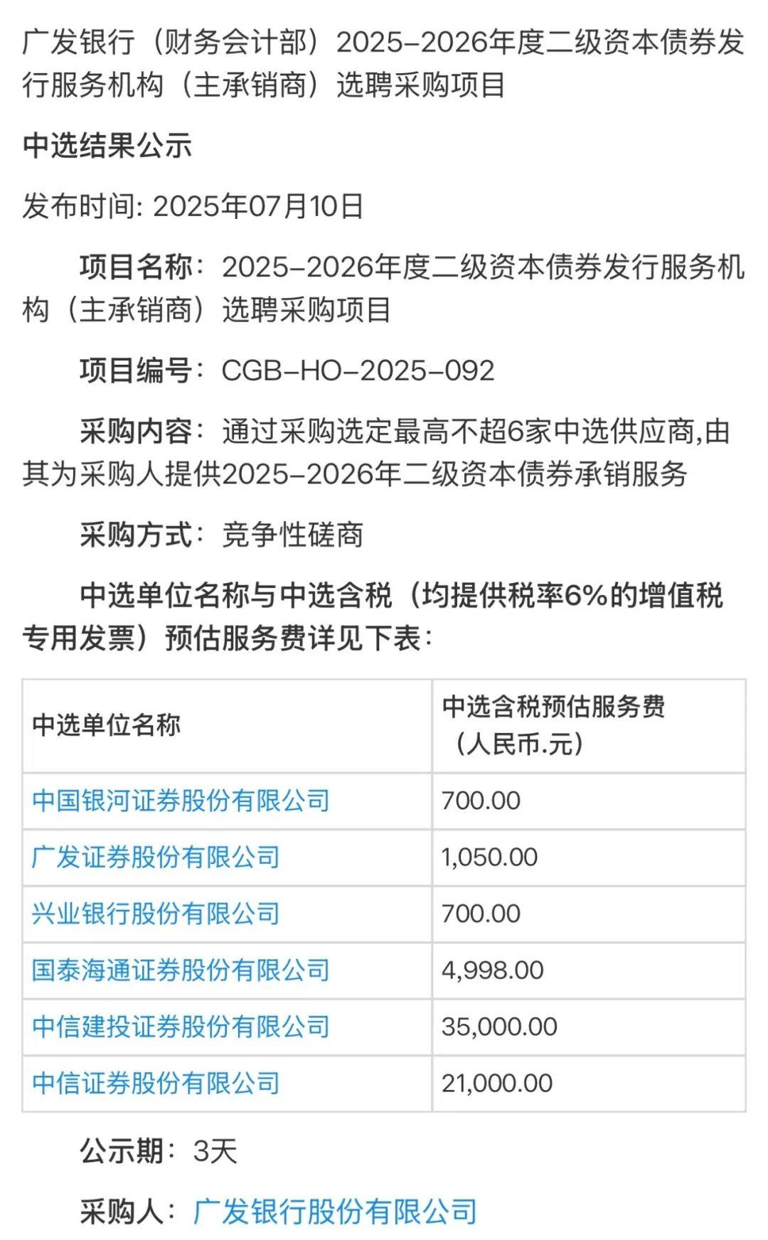 7月10日,廣發(fā)銀行對(duì)上述項(xiàng)目中選結(jié)果進(jìn)行公示,中國(guó)銀河證券、廣發(fā)證券、興業(yè)銀行、國(guó)泰海通證券、中信建投證券、中信證券等6家機(jī)構(gòu)中選,承銷服務(wù)費(fèi)總額63448元,提供稅率6%的增值稅專用發(fā)票。