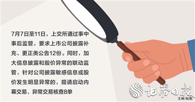 監(jiān)管部門加大事中事后監(jiān)管。比如,僅7月7日至11日期間,上交所就要求上市公司披露補(bǔ)充、更正類公告12份。同時(shí),加大信息披露和股價(jià)異常的聯(lián)動(dòng)監(jiān)管,針對公司披露敏感信息或股價(jià)發(fā)生明顯異常的,提請啟動(dòng)內(nèi)幕交易、異常交易核查8單。