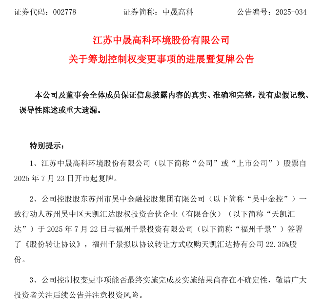 7月22日晚,中晟高科發(fā)布《關(guān)于籌劃控制權(quán)變更事項(xiàng)的進(jìn)展暨復(fù)牌公告》稱,公司控股股東蘇州市吳中金融控股集團(tuán)有限公司(以下簡(jiǎn)稱“吳中金控”)一致行動(dòng)人蘇州吳中區(qū)天凱匯達(dá)股權(quán)投資合伙企業(yè)(有限合伙)(以下簡(jiǎn)稱“天凱匯達(dá)”)于7月22日與福州千景投資有限公司(以下簡(jiǎn)稱“福州千景”)簽署了《股份轉(zhuǎn)讓協(xié)議》,福州千景擬以協(xié)議轉(zhuǎn)讓方式收購(gòu)天凱匯達(dá)持有公司22.35%股份。公司股票自7月23日開(kāi)市起復(fù)牌。