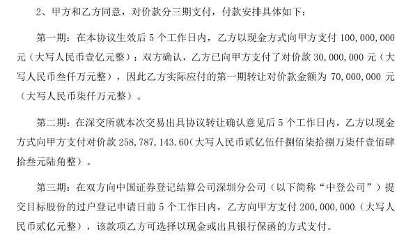 對(duì)價(jià)款分三期支付。第一期在本協(xié)議生效后5個(gè)工作日內(nèi),福州千景以現(xiàn)金方式向天凱匯達(dá)支付1億元;雙方確認(rèn),福州千景已向天凱匯達(dá)支付了對(duì)價(jià)款3000萬(wàn)元,因此福州千景實(shí)際應(yīng)付的第一期轉(zhuǎn)讓對(duì)價(jià)款金額為7000萬(wàn)元。第二期在深交所就本次交易出具協(xié)議轉(zhuǎn)讓確認(rèn)意見(jiàn)后5個(gè)工作日內(nèi),福州千景以現(xiàn)金方式向天凱匯達(dá)支付對(duì)價(jià)款2.59億元。第三期在雙方向中國(guó)證券登記結(jié)算公司深圳分公司提交目標(biāo)股份的過(guò)戶登記申請(qǐng)日前5個(gè)工作日內(nèi),福州千景向天凱匯達(dá)支付2億元,可選擇以現(xiàn)金或出具銀行保函的方式支付。