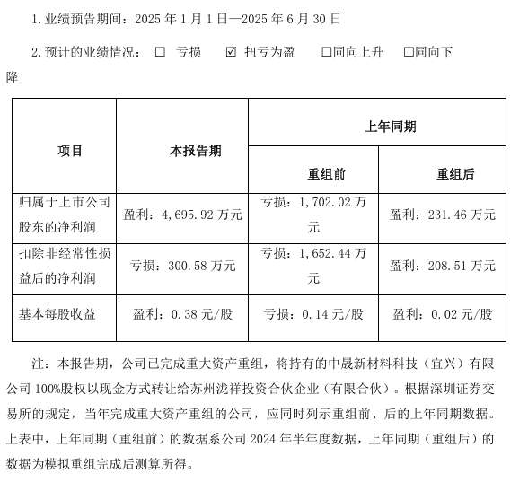 公司稱,公司實(shí)施完成重大資產(chǎn)重組,將持有的中晟新材料科技(宜興)有限公司100%股權(quán)以現(xiàn)金方式轉(zhuǎn)讓給蘇州瀧祥投資合伙企業(yè)(有限合伙),產(chǎn)生投資收益4846.38萬(wàn)元。公司環(huán)保板塊上半年工程結(jié)算收入較少,導(dǎo)致扣除非經(jīng)常性損益后歸屬于上市公司股東的凈利潤(rùn)為負(fù)數(shù)。