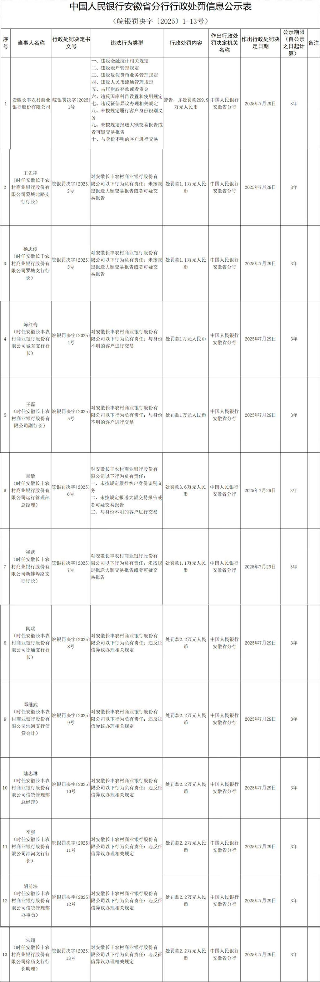 具體看,時任長豐農(nóng)商行蒙城北路支行行長王先祥、時任長豐農(nóng)商行羅塘支行行長楊志俊、時任長豐農(nóng)商行新蚌埠路支行行長崔躍被處罰款1.1萬元,對長豐農(nóng)商行未按規(guī)定報送大額交易報告或者可疑交易報告負(fù)有責(zé)任;