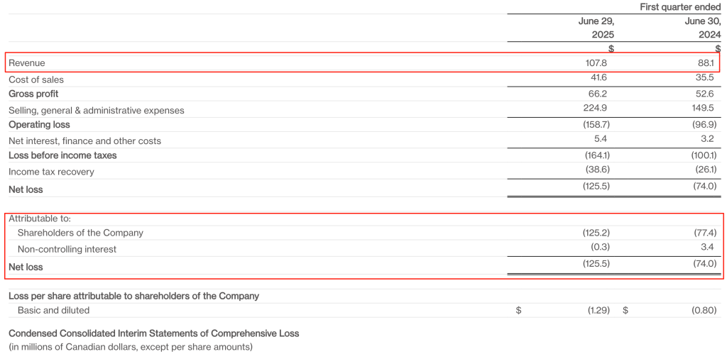 加拿大鵝是全球高性能奢華生活方式品牌,一家定位高端的羽絨服制造公司,創(chuàng)立于1957年。據(jù)加拿大鵝7月31日發(fā)布的截至2025年6月29日的2026財年第一財季財務(wù)業(yè)績顯示,第一財季實現(xiàn)營收1.078億美元,同比增長22.4%,按固定匯率計算增長21.5%;歸母凈虧損為-1.252億美元,去年同期為-0.774億美元,虧損同比擴(kuò)大超六成。