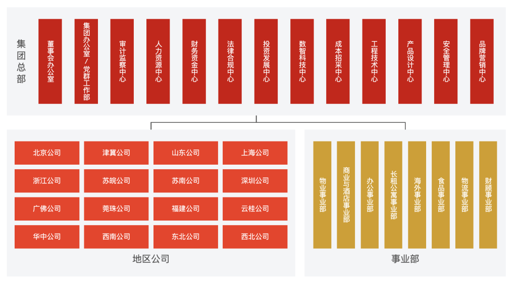 根據(jù)最新的組織架構(gòu),萬科集團總部除了董事會辦公室、集團辦公室/黨群工作部外,還設有投資發(fā)展中心、成本招采中心、工程技術(shù)中心、產(chǎn)品設計中心等11個中心;地區(qū)公司分為北京公司、津冀公司、山東公司、上海公司等16個公司;原物業(yè)事業(yè)集團(BG)等統(tǒng)一歸為事業(yè)部,目前包含物業(yè)、商業(yè)與酒店、辦公、長租公寓、物流等八大多元化業(yè)務。
