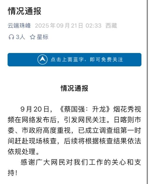 9月21日,“云端珠峰”微信公眾號(hào)發(fā)布情況通報(bào)指出,日喀則市委、市政府高度重視,已成立調(diào)查組第一時(shí)間趕赴現(xiàn)場核查,后續(xù)將根據(jù)核查結(jié)果依法依規(guī)處理。