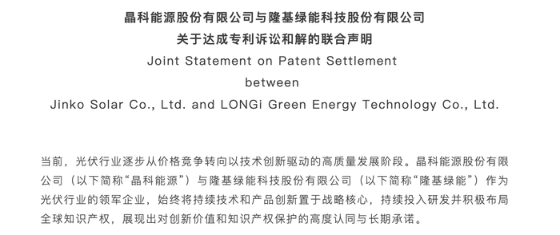 聲明以中英雙語呈現(xiàn),稱隆基綠能與晶科能源聯(lián)合宣布,就雙方及雙方關(guān)聯(lián)公司在全球范圍內(nèi)正在進行的相關(guān)專利主張和法律事項,達成和解協(xié)議。