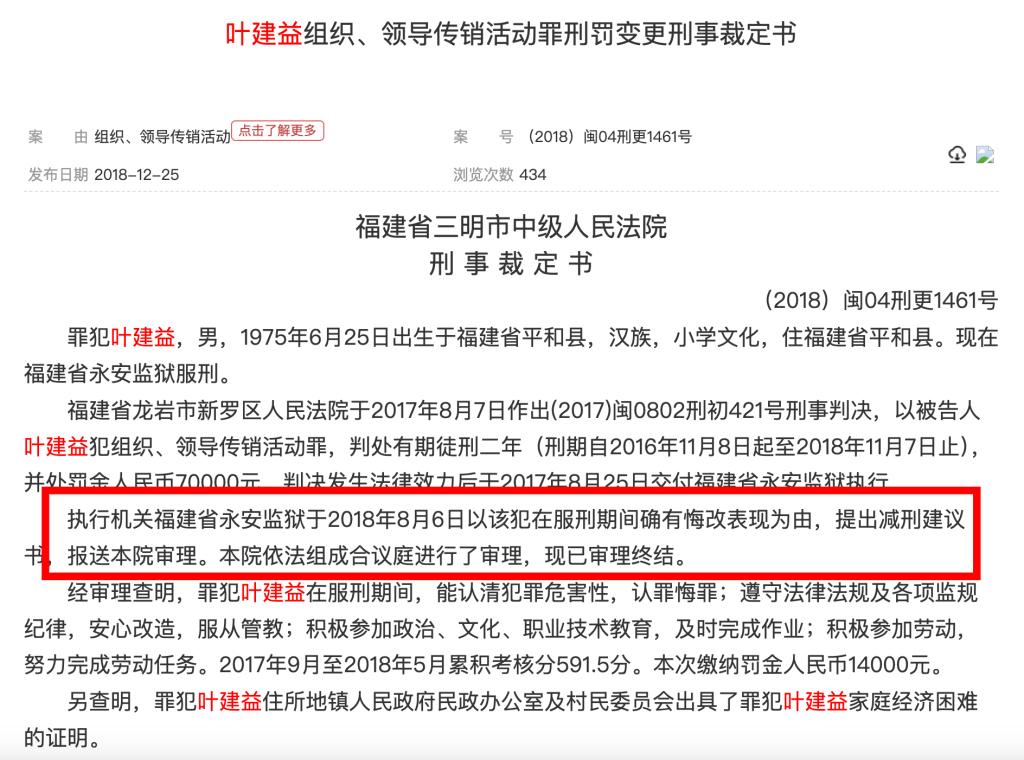2018年12月,中國(guó)裁判文書網(wǎng)另披露過(guò)一份《葉建益組織、領(lǐng)導(dǎo)傳銷活動(dòng)罪刑罰變更刑事裁定書》,福建省三明市中級(jí)人民法院公開的一份刑事裁定書顯示,執(zhí)行機(jī)關(guān)福建省永安監(jiān)獄于2018年8月6日以該犯在服刑期間確有悔改表現(xiàn)為由,提出減刑建議書,報(bào)送本院審理。本院認(rèn)為,罪犯葉建益在服刑期間確有悔改表現(xiàn),符合減刑條件。裁定:對(duì)罪犯葉建益減去有期徒刑二個(gè)月,刑期自2016年11月8日起至2018年9月7日止。