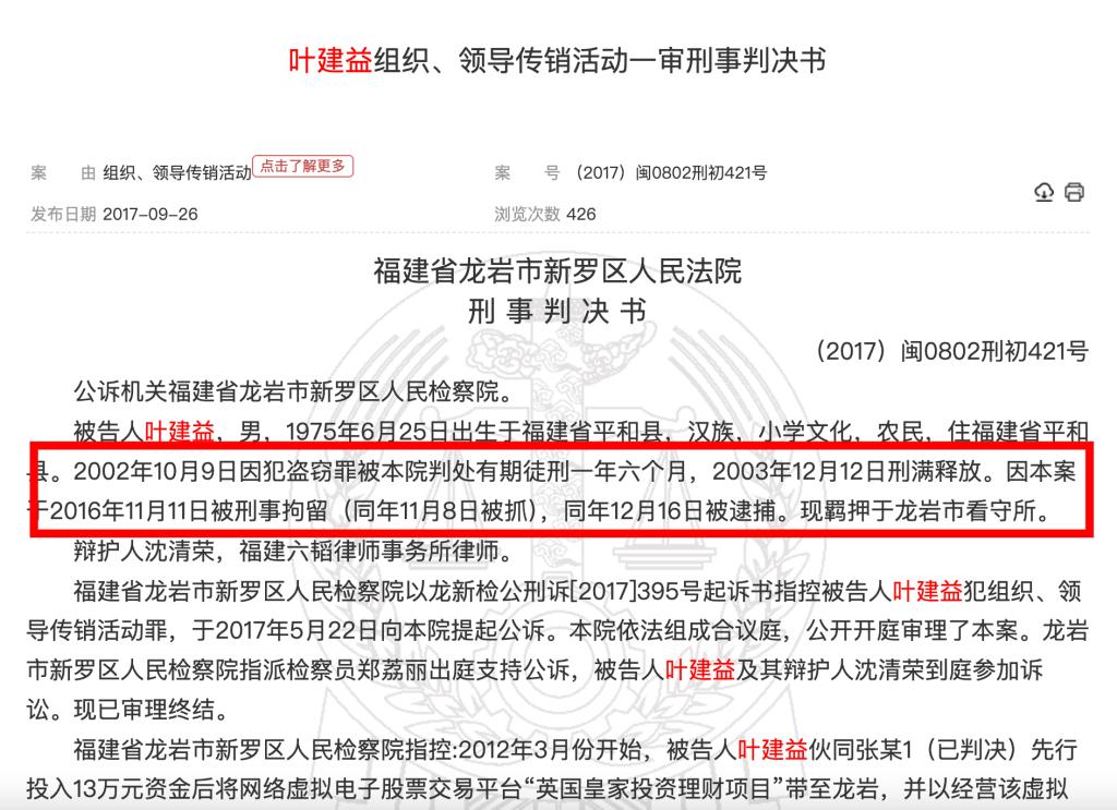 澎湃新聞根據(jù)中國(guó)裁判文書網(wǎng)檢索發(fā)現(xiàn),福建省龍巖市新羅區(qū)人民法院于2017年9月公開的一份刑事判決書顯示,葉建益1975年出生,小學(xué)文化,2002年因盜竊罪獲刑一年六個(gè)月,于2003年12月釋放;2016年又因組織、領(lǐng)導(dǎo)傳銷活動(dòng)罪被判處有期徒刑二年,涉案60余人、涉案金額130余萬(wàn)元。