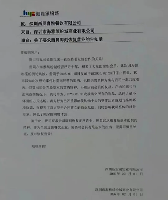 該告知函顯示,因為預(yù)制菜的輿論風(fēng)波,西貝喜悅餐飲于2026年1月15日向海雅繽紛城發(fā)函,申請2026年2月28日停止?fàn)I業(yè)。為一起度過難關(guān),該商城提供了多種方案給西貝喜悅餐飲。但“在未經(jīng)我司書面同意的情況下,貴司單方于2026年1月31日晚欲清空所有的物品,選擇了最不體面的方式逃場”。界面新聞注意到,該告知函沒有蓋章。