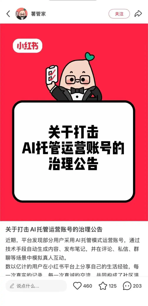 即日起,小紅書將對(duì)AI托管類賬號(hào)實(shí)施以下治理措施:
