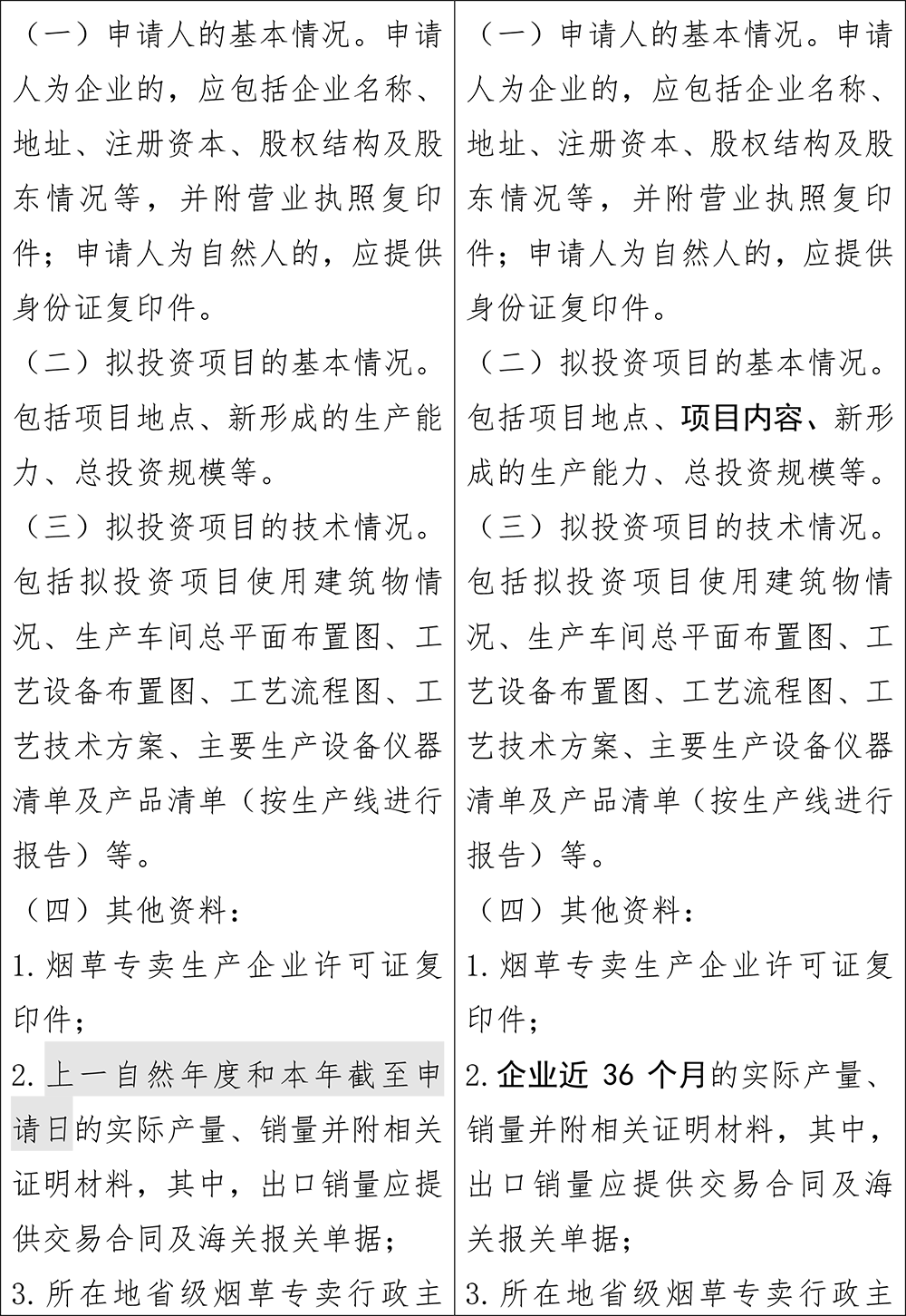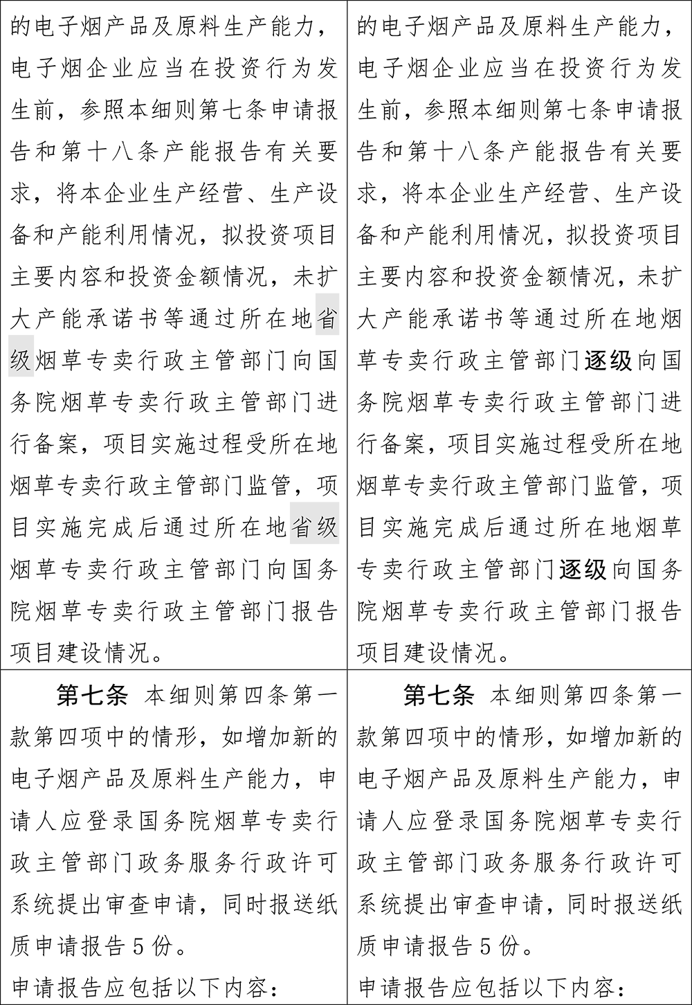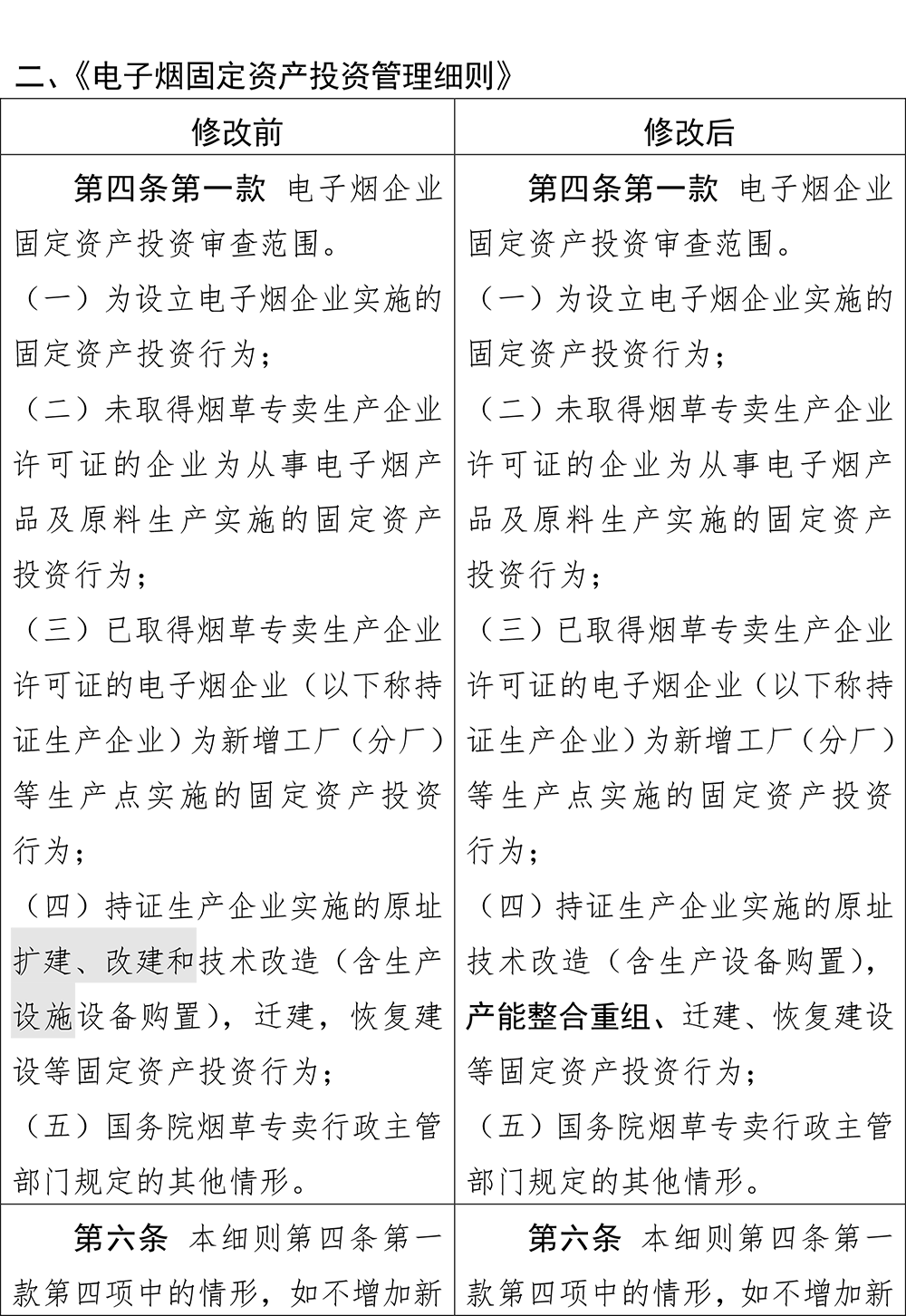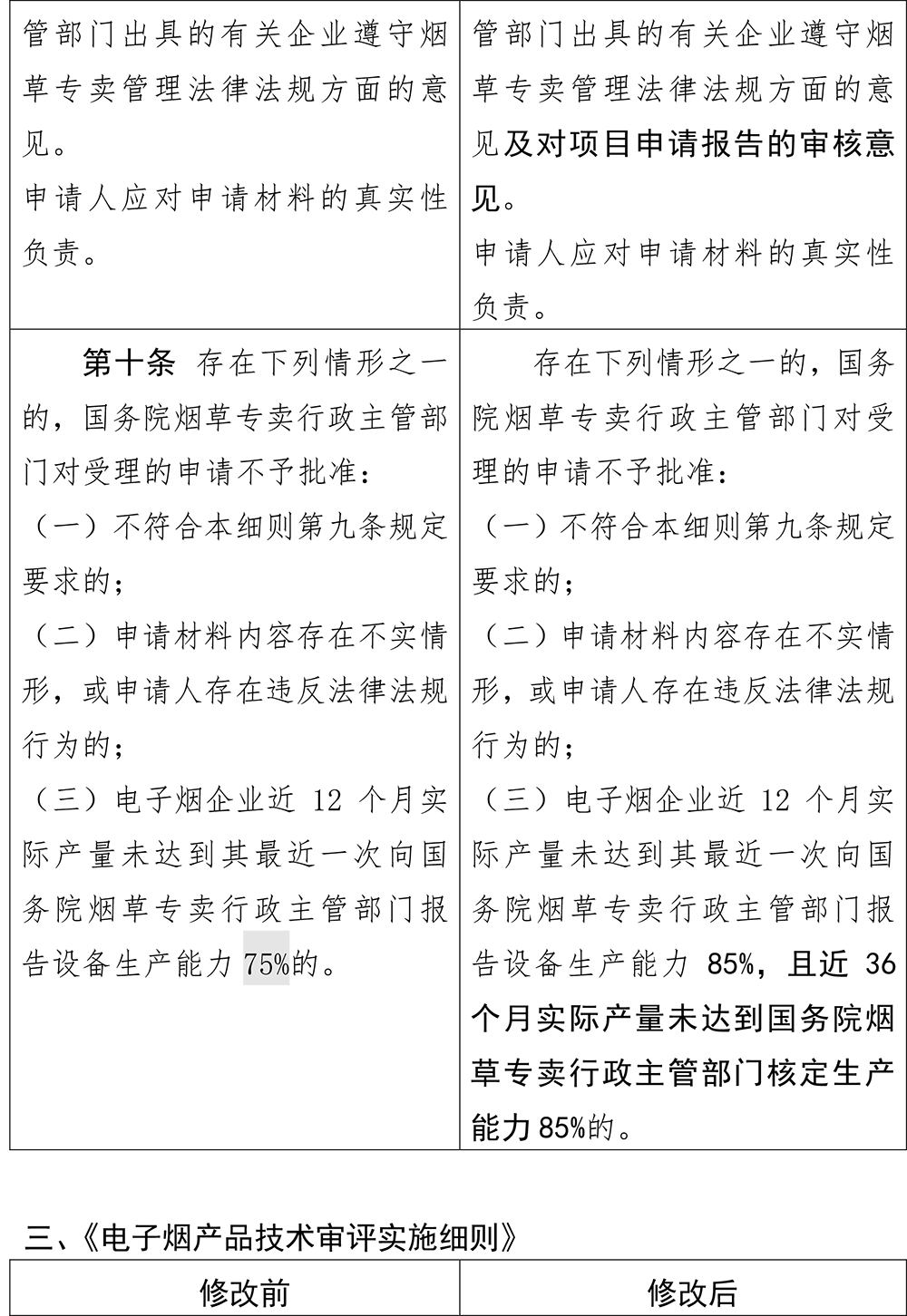 《電子煙固定資產(chǎn)投資管理細(xì)則》的修改涉及五處,其中,第十條第三項(xiàng)不予批準(zhǔn)情形收緊:電子煙企業(yè)近12個(gè)月實(shí)際產(chǎn)量未達(dá)到其最近一次向國務(wù)院煙草專賣行政主管部門報(bào)告設(shè)備生產(chǎn)能力85%,且近36個(gè)月實(shí)際產(chǎn)量未達(dá)到國務(wù)院煙草專賣行政主管部門核定生產(chǎn)能力85%的。國務(wù)院煙草專賣行政主管部門對(duì)受理的申請(qǐng)不予批準(zhǔn)。