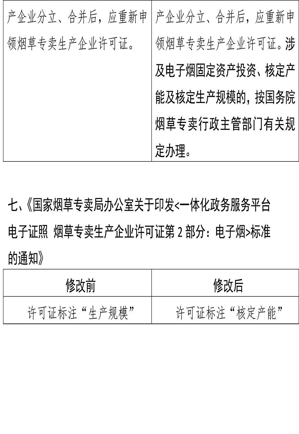 此外,《電子煙相關(guān)生產(chǎn)企業(yè)設(shè)立、分立、合并、撤銷管理細(xì)則》第二十二條,新增“電子煙相關(guān)生產(chǎn)企業(yè)分立、合并后,涉及電子煙固定資產(chǎn)投資、核定產(chǎn)能及核定生產(chǎn)規(guī)模的,按國務(wù)院煙草專賣行政主管部門有關(guān)規(guī)定辦理”?!秶覠煵輰Yu局辦公室關(guān)于印發(fā)<一體化政務(wù)服務(wù)平臺(tái) 電子證照 煙草專賣生產(chǎn)企業(yè)許可證第2部分:電子煙>標(biāo)準(zhǔn)的通知》則是要求將許可證標(biāo)注“生產(chǎn)規(guī)?!毙薷臑闃?biāo)注“核定產(chǎn)能”。