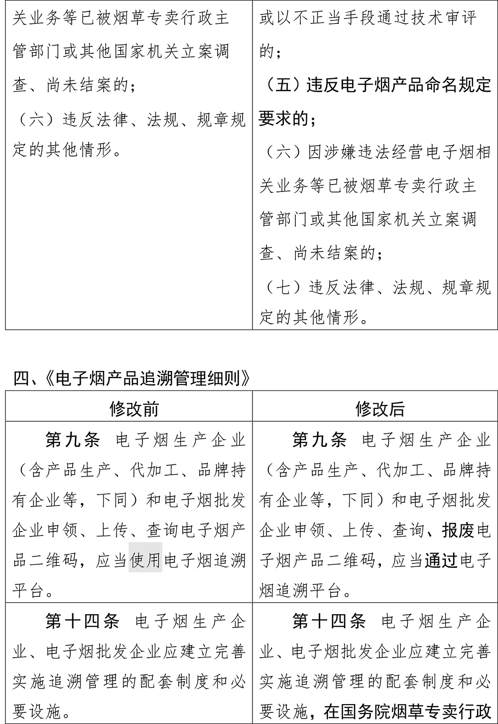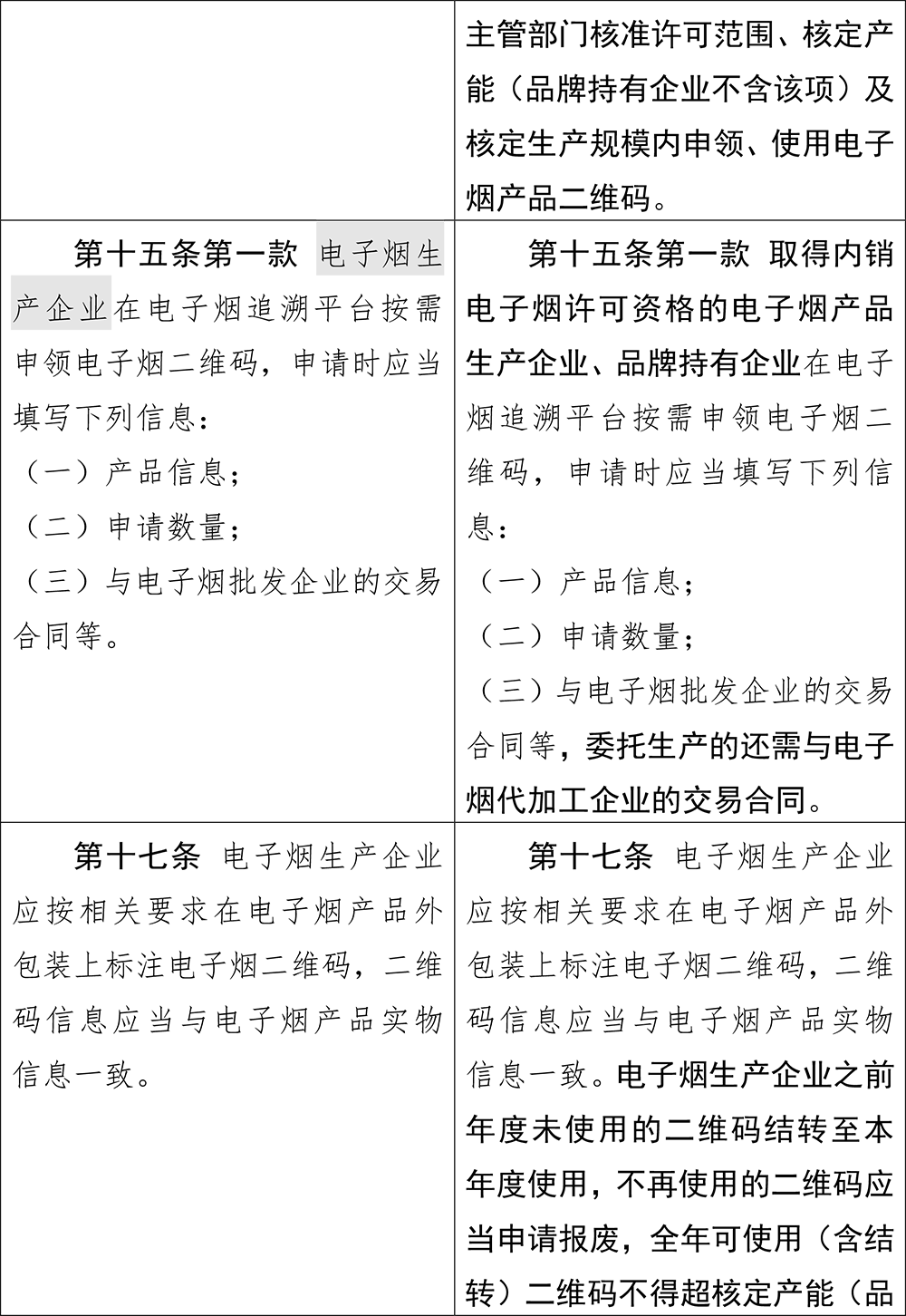 第十四條修改為“電子煙生產(chǎn)企業(yè)、電子煙批發(fā)企業(yè)應(yīng)建立完善實(shí)施追溯管理的配套制度和必要設(shè)施,在國務(wù)院煙草專賣行政主管部門核準(zhǔn)許可范圍、核定產(chǎn)能(品牌持有企業(yè)不含該項(xiàng))及核定生產(chǎn)規(guī)模內(nèi)申領(lǐng)、使用電子煙產(chǎn)品二維碼”,而在此前,第十四條只是要求“電子煙生產(chǎn)企業(yè)、電子煙批發(fā)企業(yè)應(yīng)建立完善實(shí)施追溯管理的配套制度和必要設(shè)施”,并無更細(xì)化的要求。