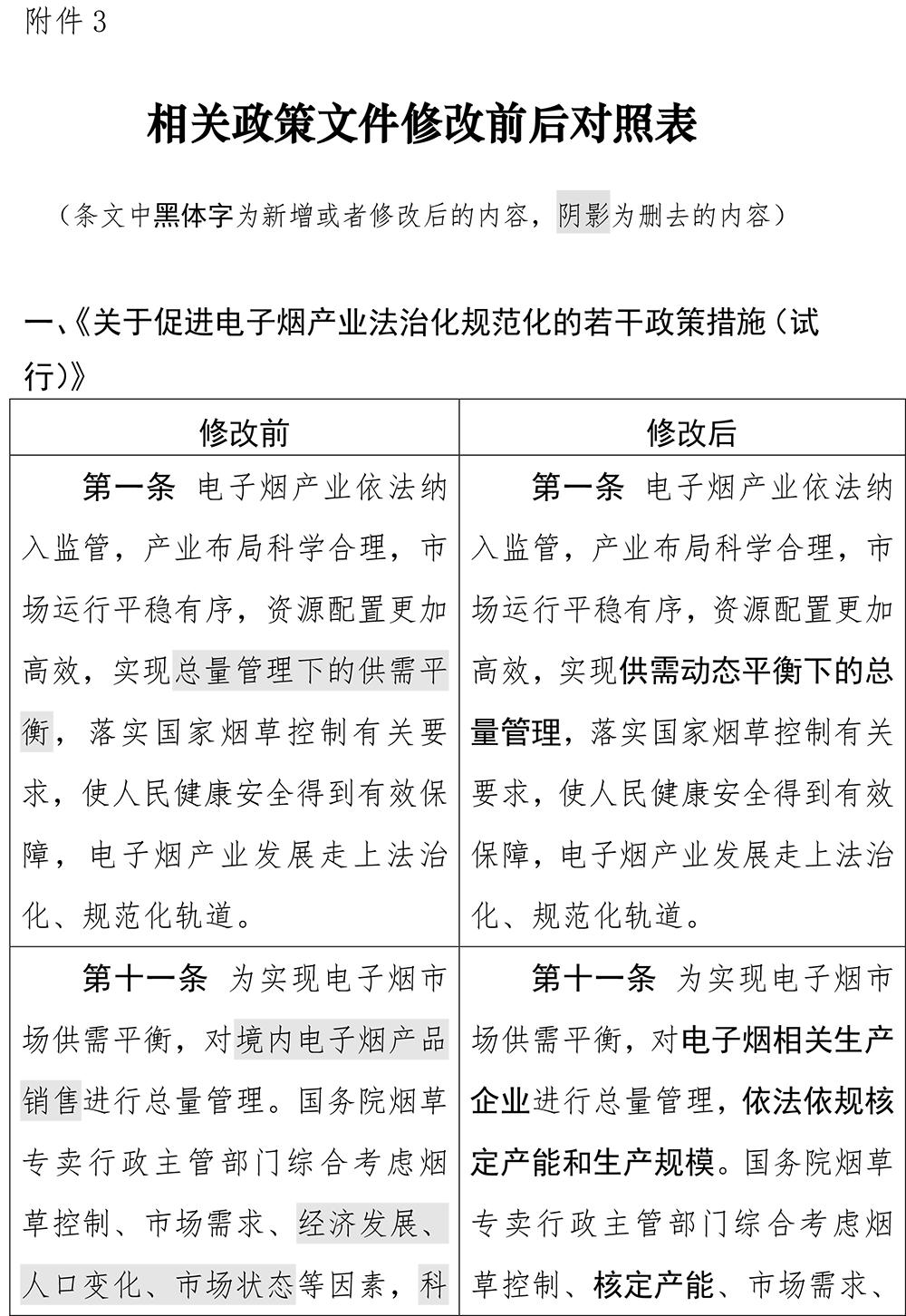 其中,在對(duì)《關(guān)于促進(jìn)電子煙產(chǎn)業(yè)法治化規(guī)范化的若干政策措施(試行)》(國煙辦〔2022〕43號(hào))作出的修改共計(jì)三條,其中將第一條修改為“電子煙產(chǎn)業(yè)依法納入監(jiān)管,產(chǎn)業(yè)布局科學(xué)合理,市場(chǎng)運(yùn)行平穩(wěn)有序,資源配置更加高效,實(shí)現(xiàn)供需動(dòng)態(tài)平衡下的總量管理?!毙薷闹暗谋硎鰟t是“實(shí)現(xiàn)總量管理下的供需平衡”。